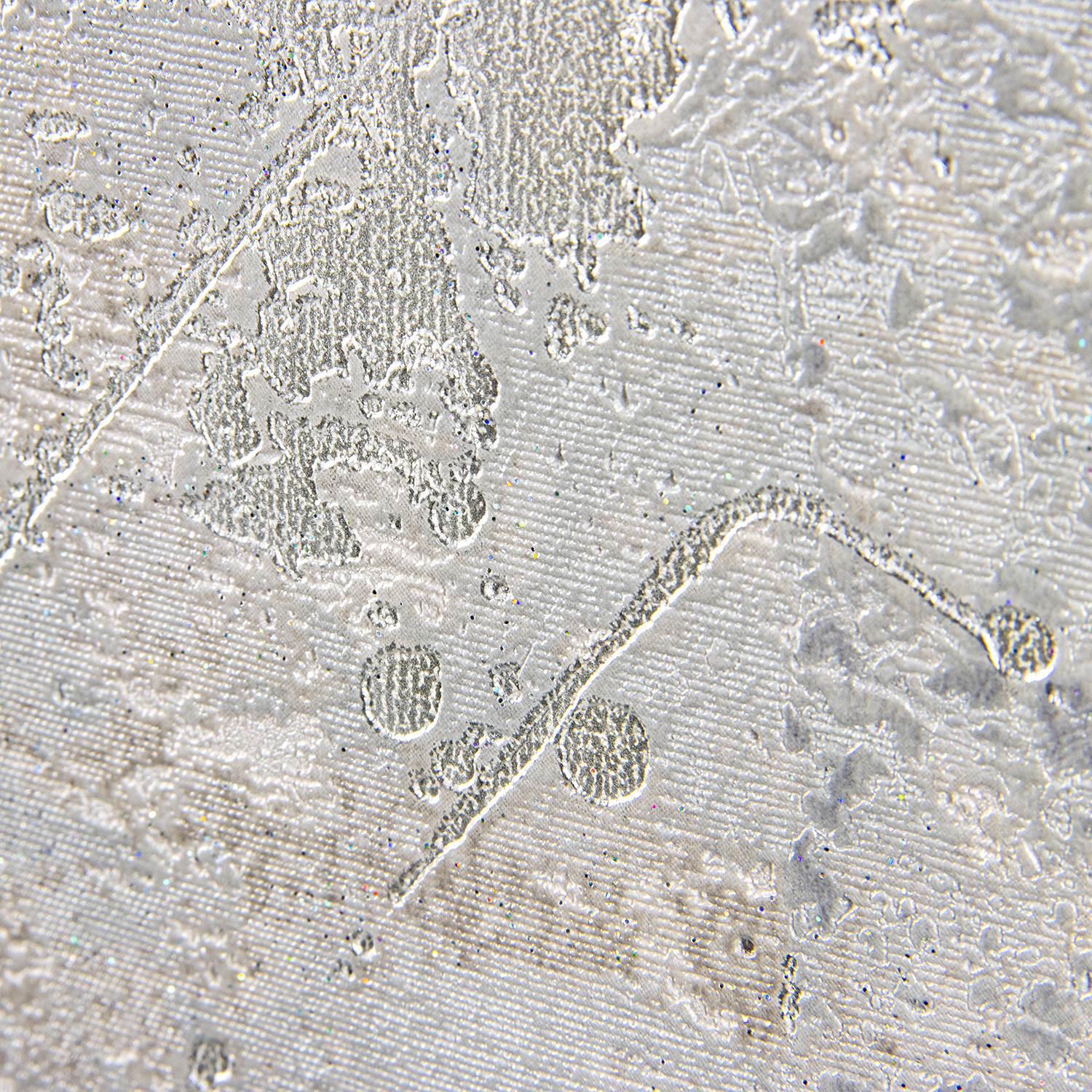 В зависимости от колористики, брызги выполнены из перламутра темного или светлого оттенка, переливающегося, словно под софитами выставочного пространства. Игру цвета также дополняют пятна, различные по своей форме и цветовому тону. Обилие разноцветного глиттера, словно вуаль покрывает полотна, усиливая эффект сияния и приковывая взор к обоям.