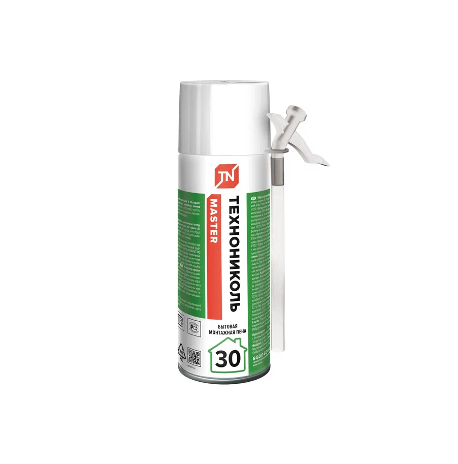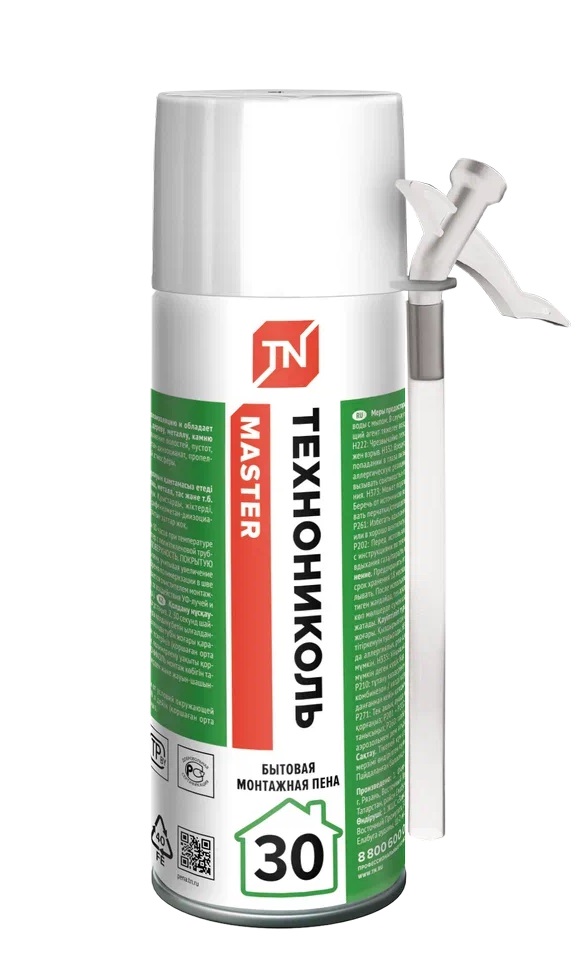 штПена монтажная ТехноНиколь MASTER 30 Бытовая представляет собой полиуретановую монтажную пену высокого качества на основе уникальной формулы, разработанной собственным научным центром. Монтажная пена обеспечивает отличную звуко- и теплоизоляцию и обладает хорошей адгезией к большинству строительных материалов: бетону, дереву, металлу, камню и т. п.