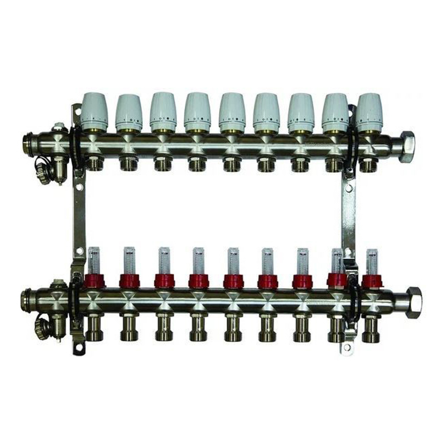Коллекторная группа Millennium с расходомерами выполнена из нержавеющей стали, имеет регулировочные и термостатические вентили. Применяется при монтаже радиаторного отопления и теплых полов.