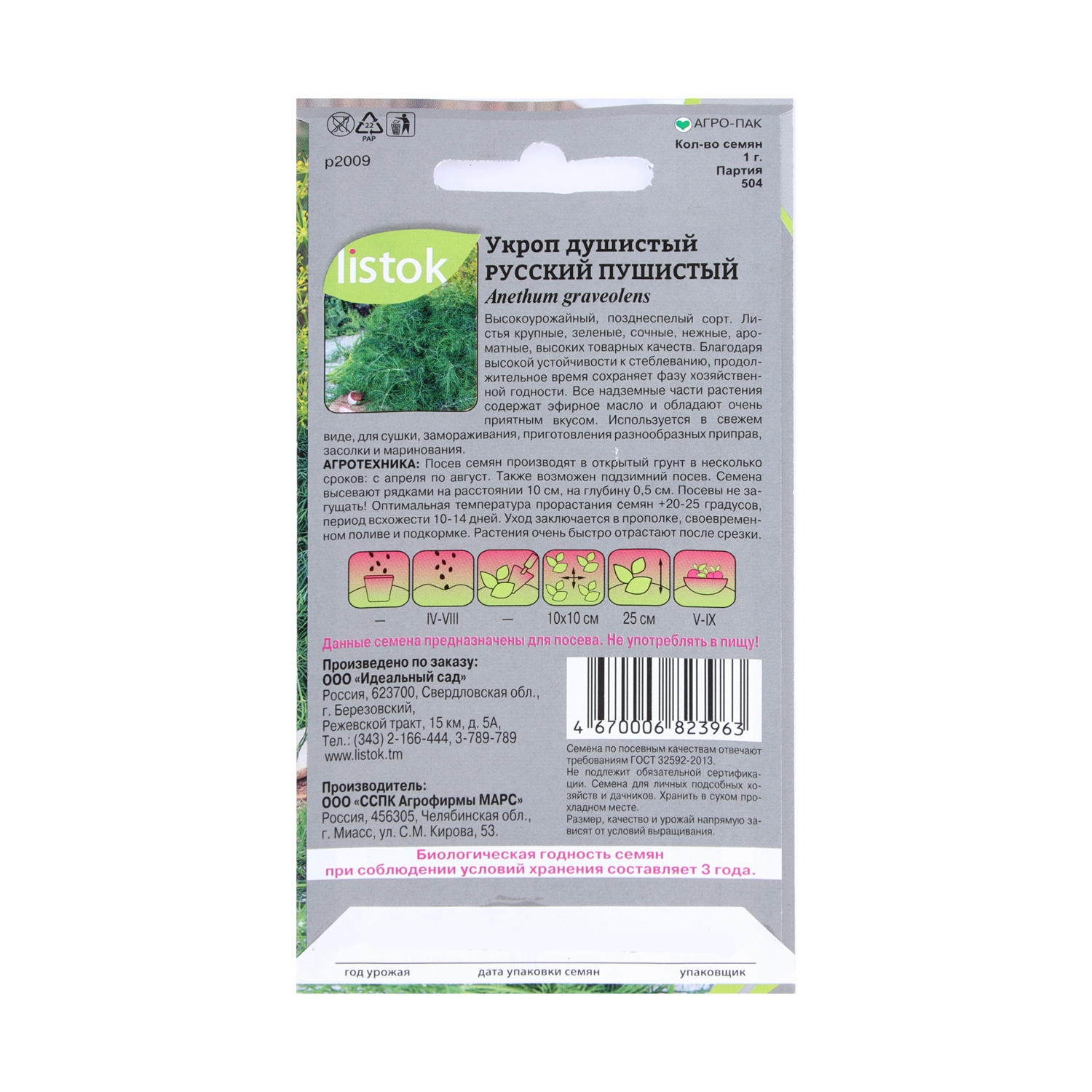 Семена Укроп Душистый Русский пушистый 1гр LISTOK ПРОФИ *10/500