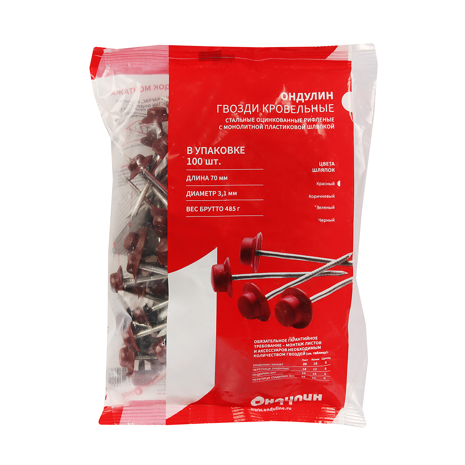 Гвозди Ондулин красные обеспечивают надежное крепление кровли, герметизацию и исключительную устойчивость к воздействию ветра. Подходят для: листов Ондулин Смарт, черепицы Ондулин, Ондувиллы.