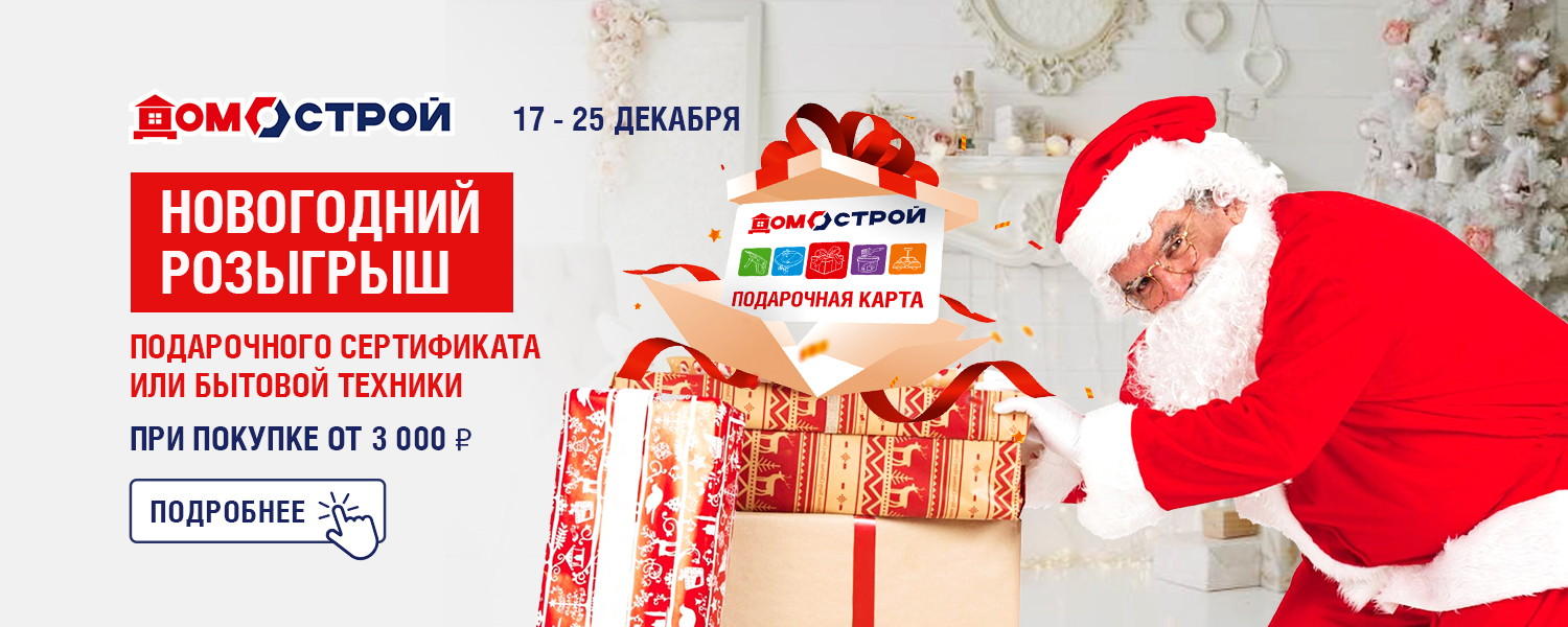Новогодний розыгрыш в магазине ДомоСтрой в г. Красноуфимск, ул. 8 Марта, д. 78/2. С 17 по 25 декабря совершите покупку в магазине на сумму от 3 000 рублей с новогодним товаров в чеке и получите шанс выиграть подарочный сертификат или бытовую технику.